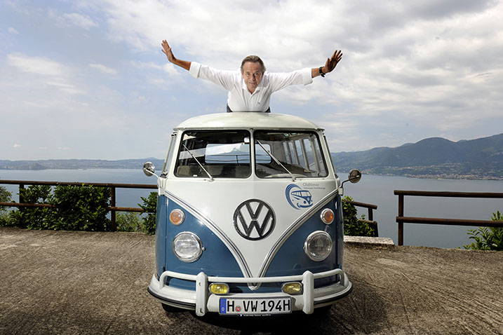 Rennsportlegende Jacky Ickx mit dem VW T1 Sambabus am Gardasee